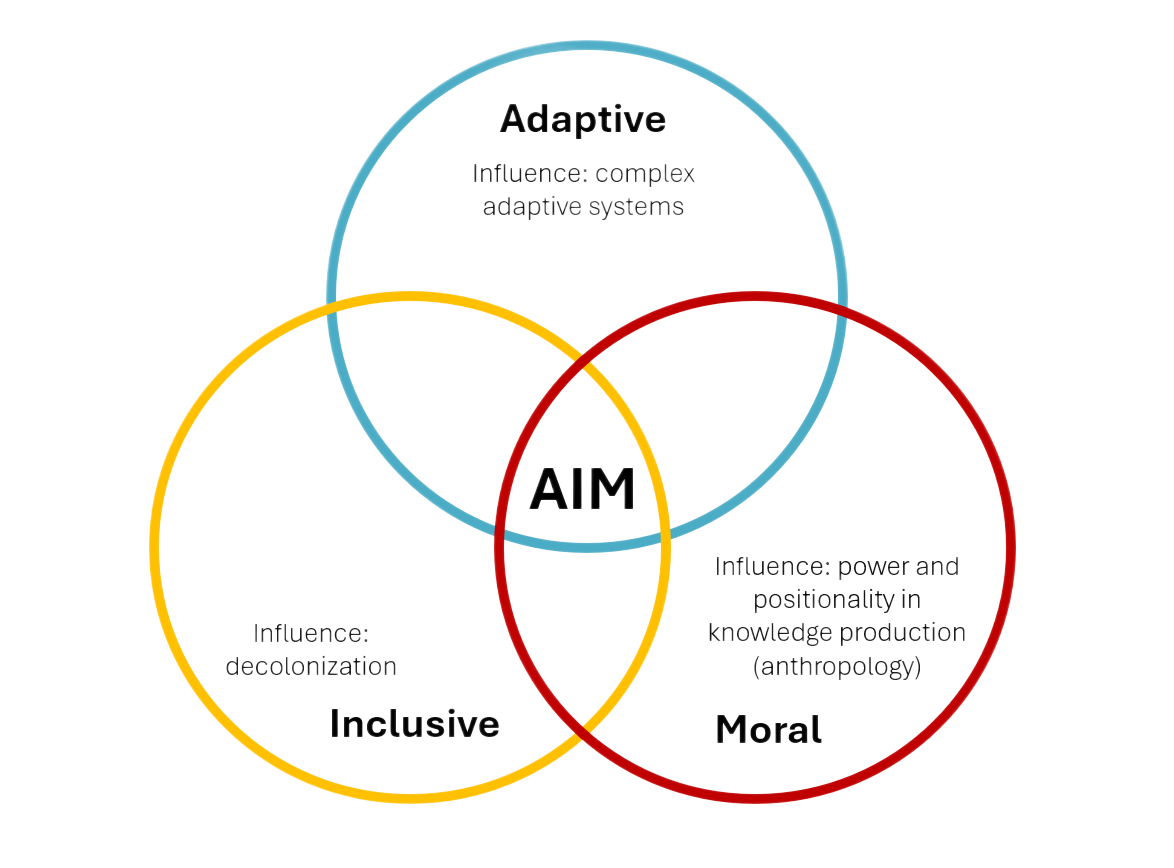 AIM integrates but transcends three major sources of influence. First, it draws on complex adaptive systems (CAS) theories but critiques their Western-centric orientation. In reality, CAS concepts were already present in many non-Western philosophies. Second, AIM is inspired by decolonizing discourses, but it does not only stop at critiques. Rather, AIM advances and practices a different kind of social science, for example, by tracing causality (such as the process of socio-economic modernization) and measuring core concepts (such as corruption) differently. Third, tapping from anthropology, AIM applies the lens of positionality and the politics of knowledge production to expose normative biases hidden in ostensibly “objective” social theories and metrics - and crucially, takes concrete steps to redress them.